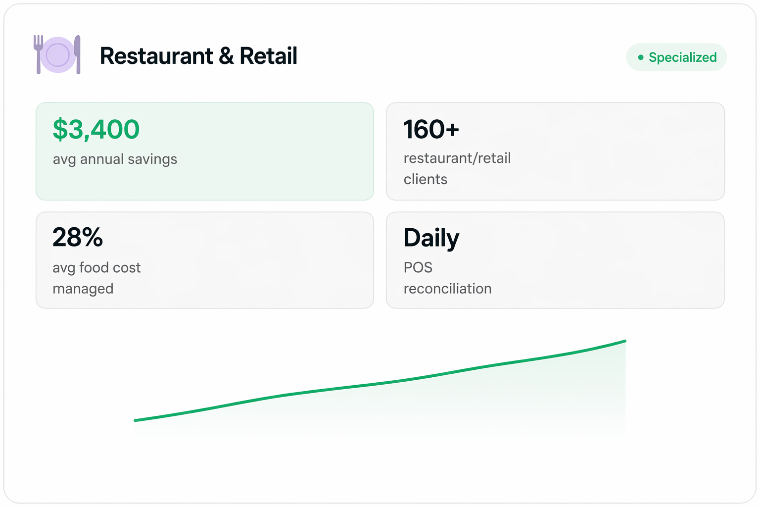 Restaurants, Cafes, Bars, Salons, Auto Repair, Retail Stores. AI-powered bookkeeping and financial services built specifically for your industry.